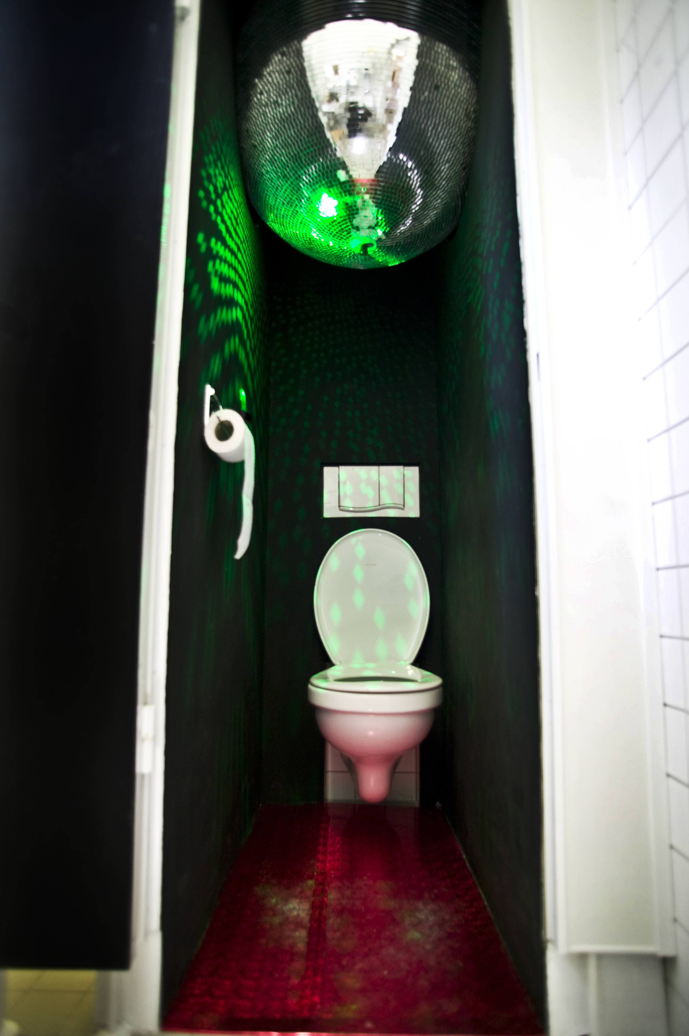 In einer öffentlichen Toilette wurden die vorhandenen Wände der Toilettenzelle nach innen verkleinert. Im selben Raum wurde eine Diskokugel, mit einem Durchmesser von 1m installiert, Die sich drehende Diskokugel ragte in die seitlichen Wände der Toilettenzelle hinein.Die funktionsfähige Toilettendisko, incl. Licht u. Ton, in der man 80er Jahre Musik zu hören bekam, war für alle Besucher der Ausstellung frei zugänglich.