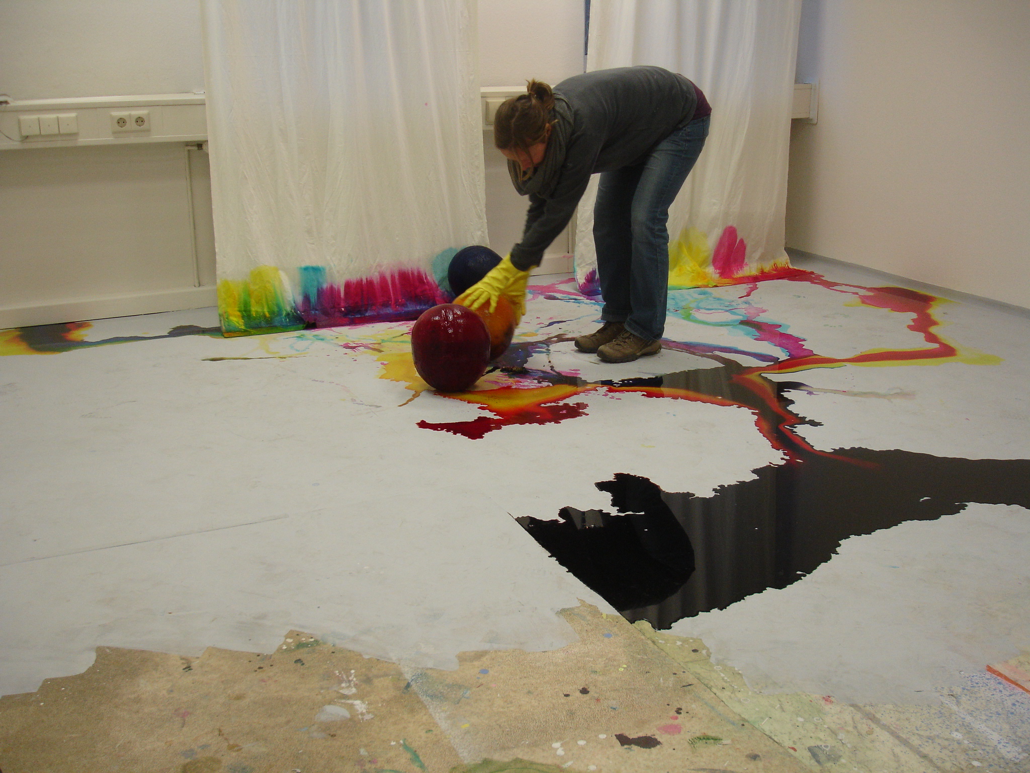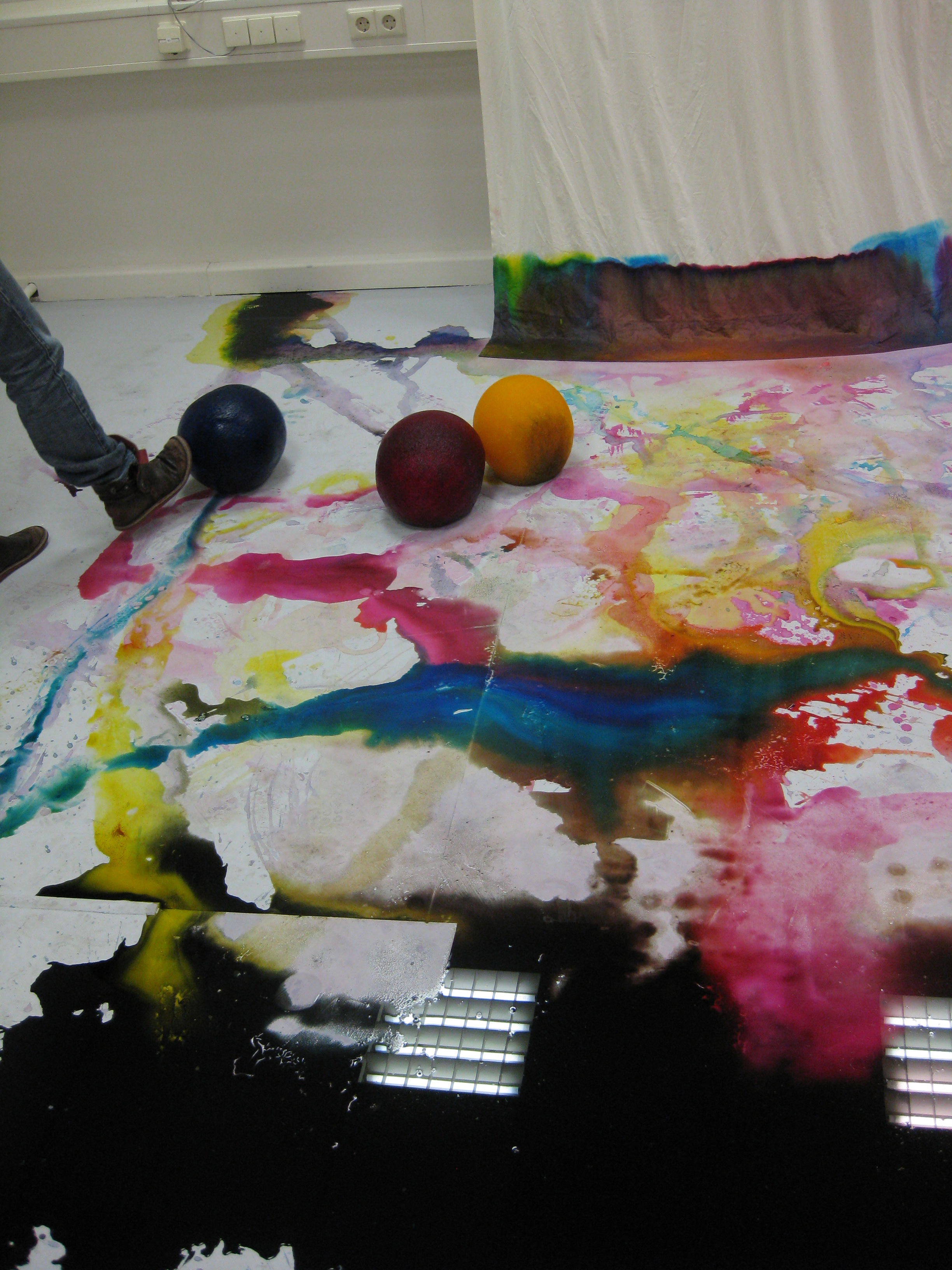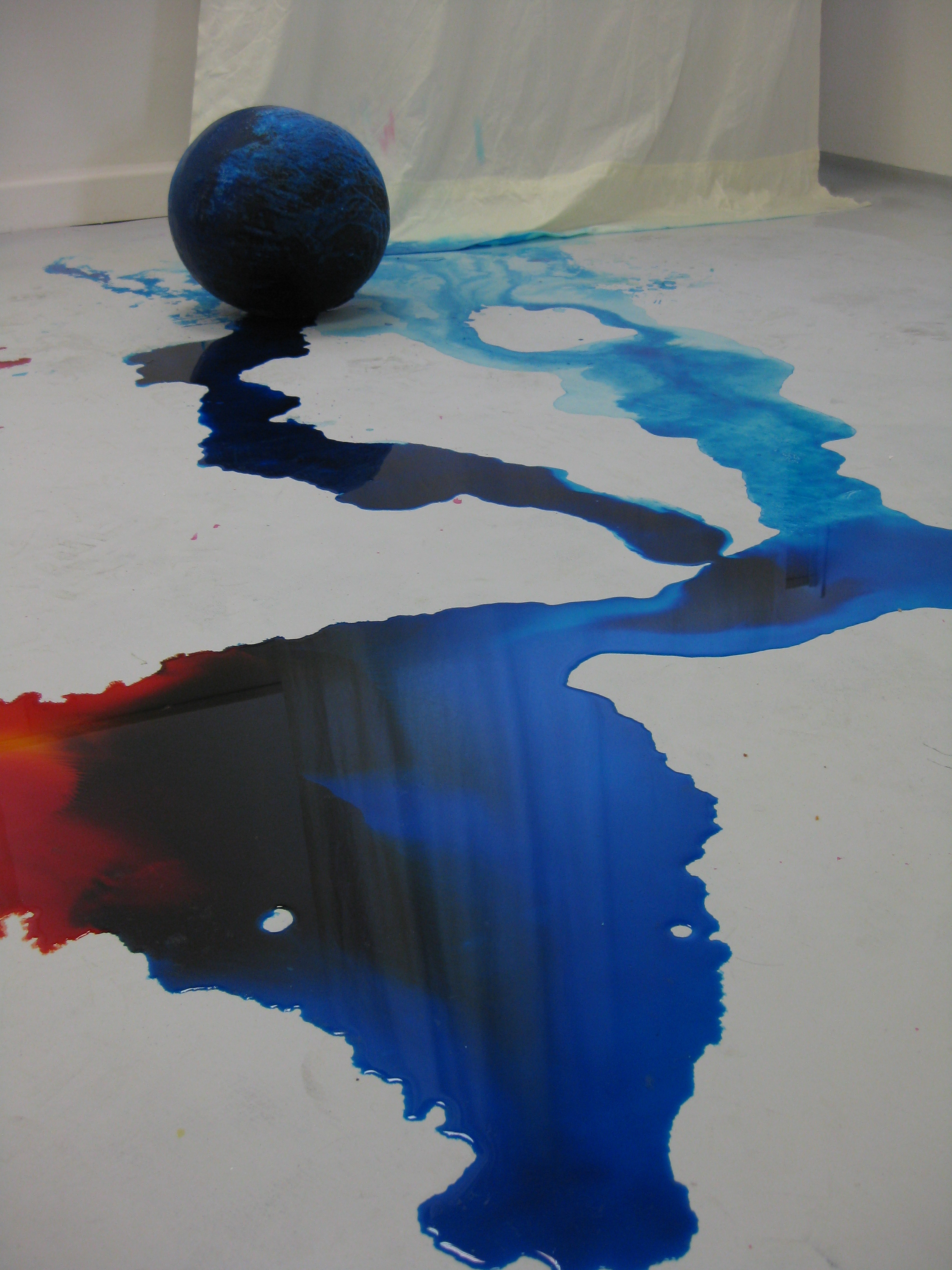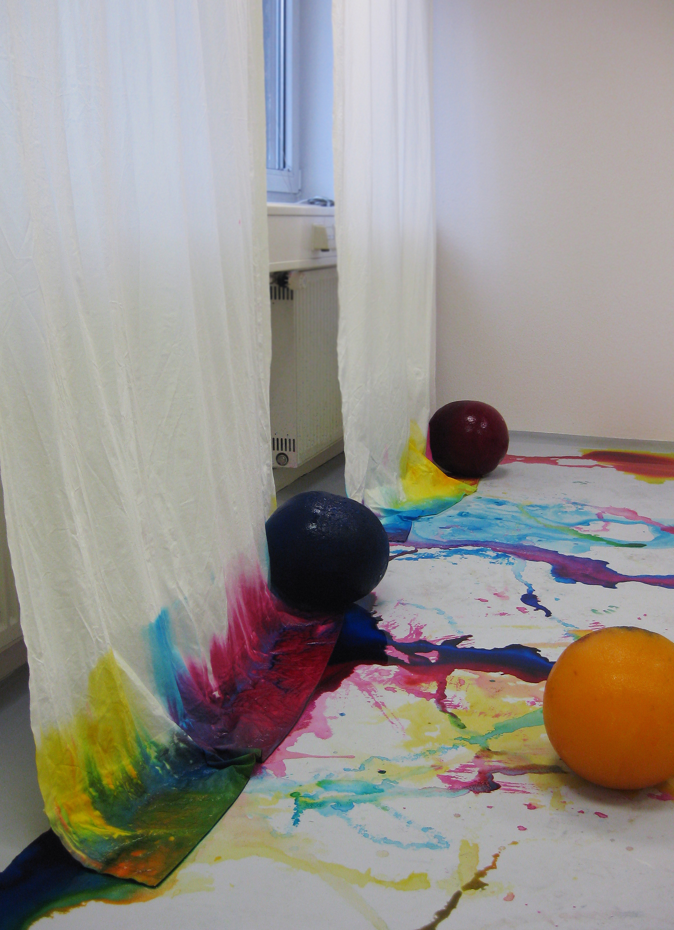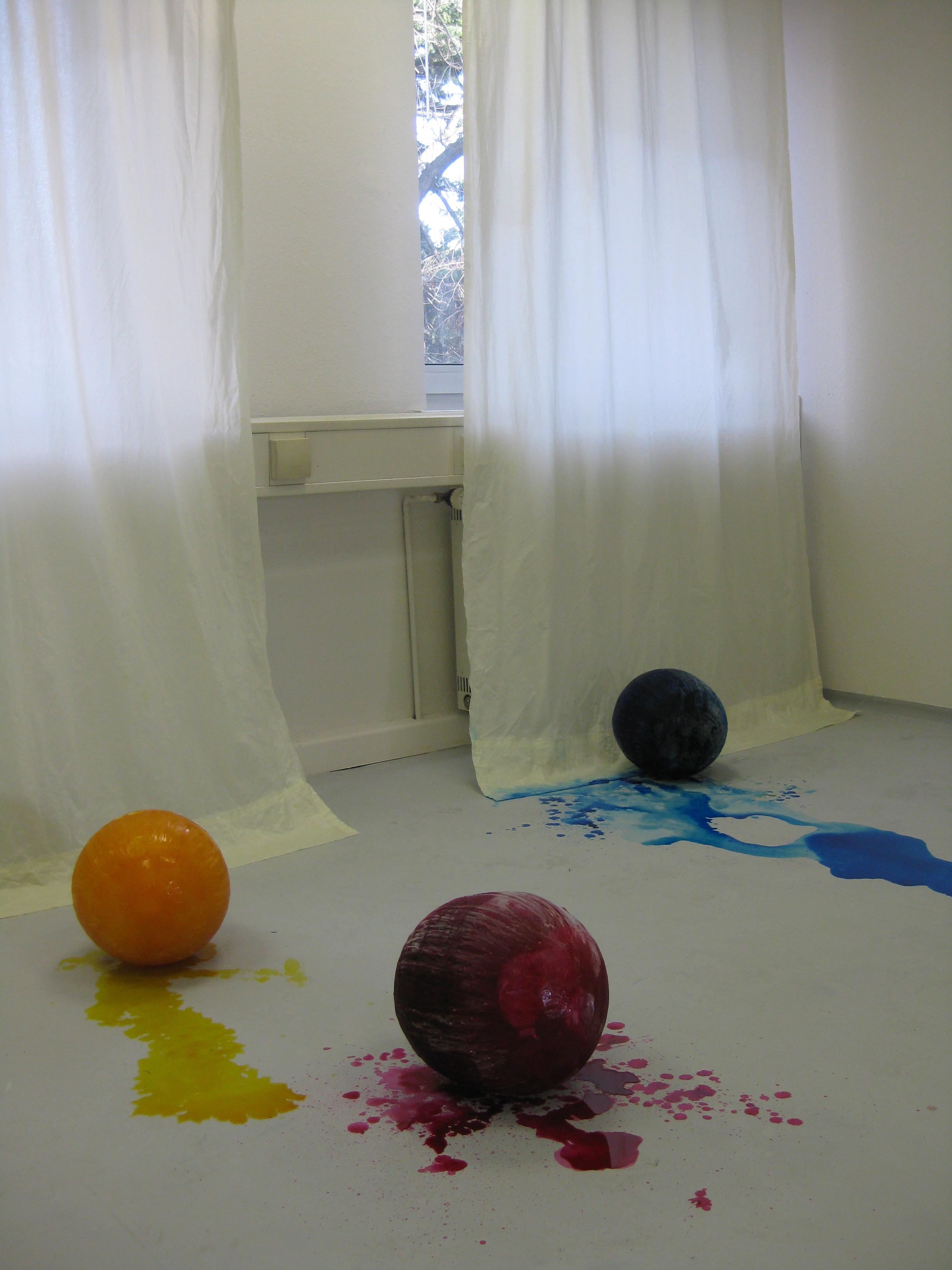 Im Raum liegen drei, aus gefärbtem Wasser geforene Eiskugeln. Auch hier wurden die drei Grundfarben verwendet. Die Kugeln schmelzen und werden hin und wieder von der Künstlerin durch den Raum gerollt. Die Vorhänge an den Fenstern im Ausstellungsraum hängen bis auf den Boden hinab und saugen das entstehende Schmelzwasser auf.